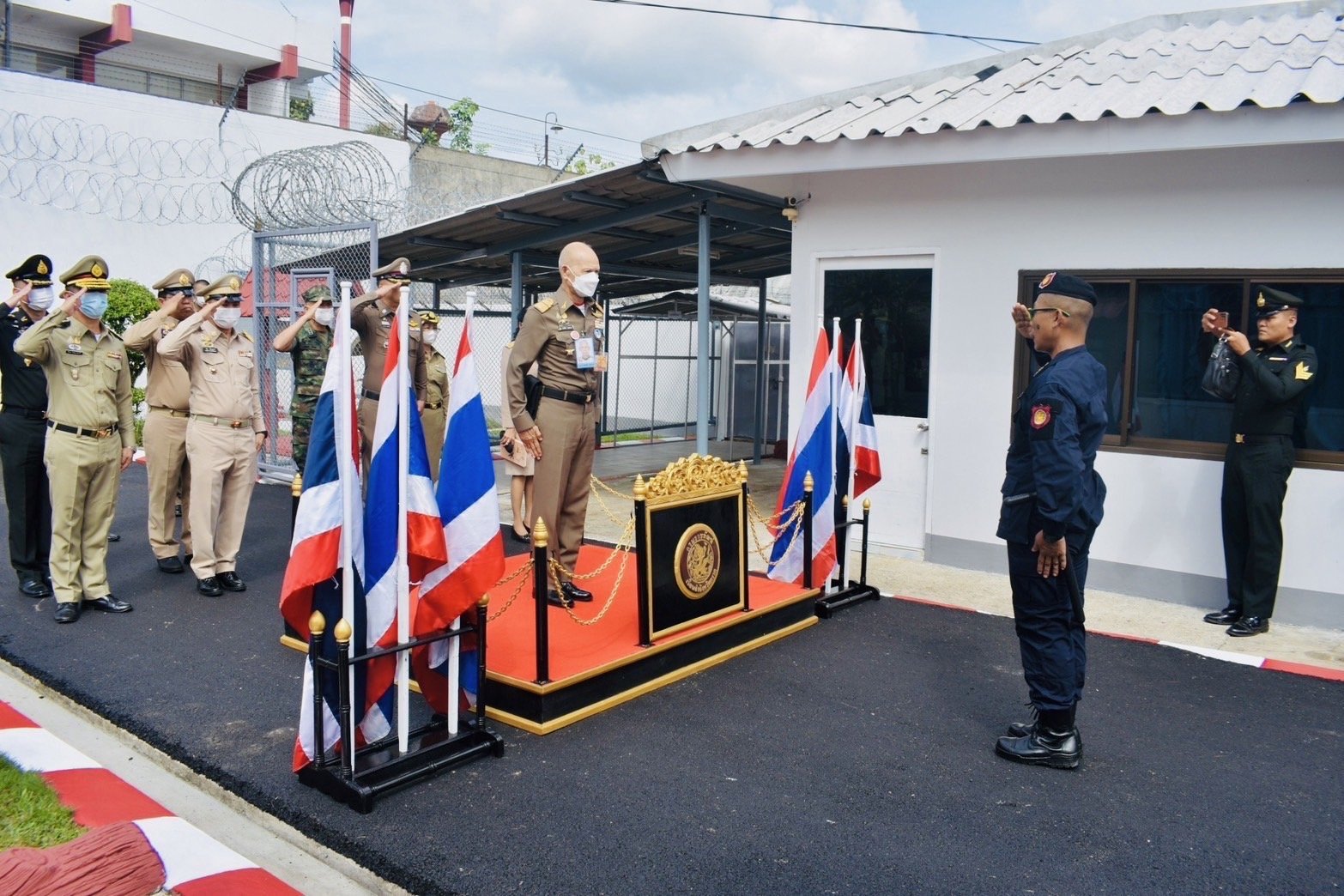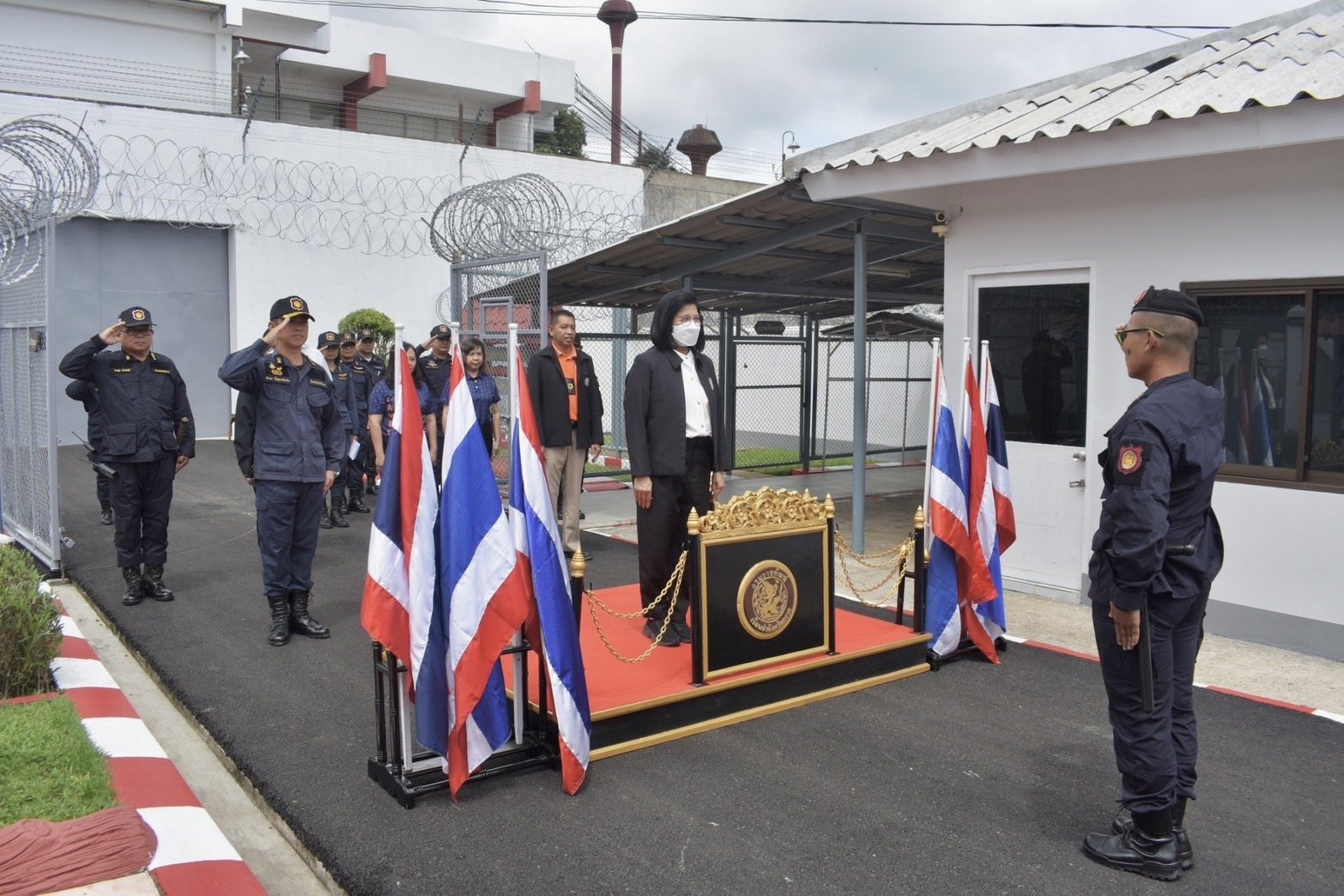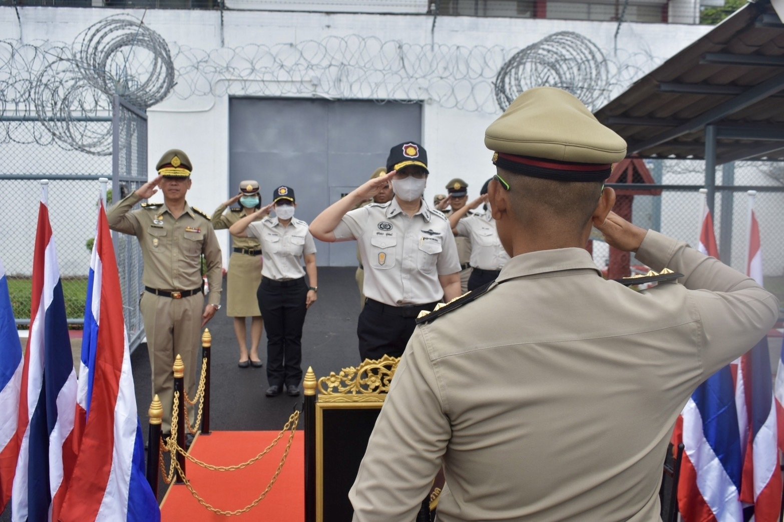 นายรัตนะ ปัญญาเมืองใจ ผู้อำนวยการสถานกักขังกลางจังหวัดนครศรีธรรมราช รักษาราชการแทน ผู้บัญชาการเรือนจำจังหวัดตราด นำข้าราชการเข้าแถวเคารพธงชาติ